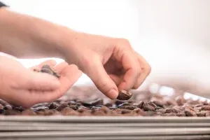 Les fèves sont triées à la main pour enlever celles qui seraient cassées, abimées ou trop petites, puis elles sont torréfiées.
